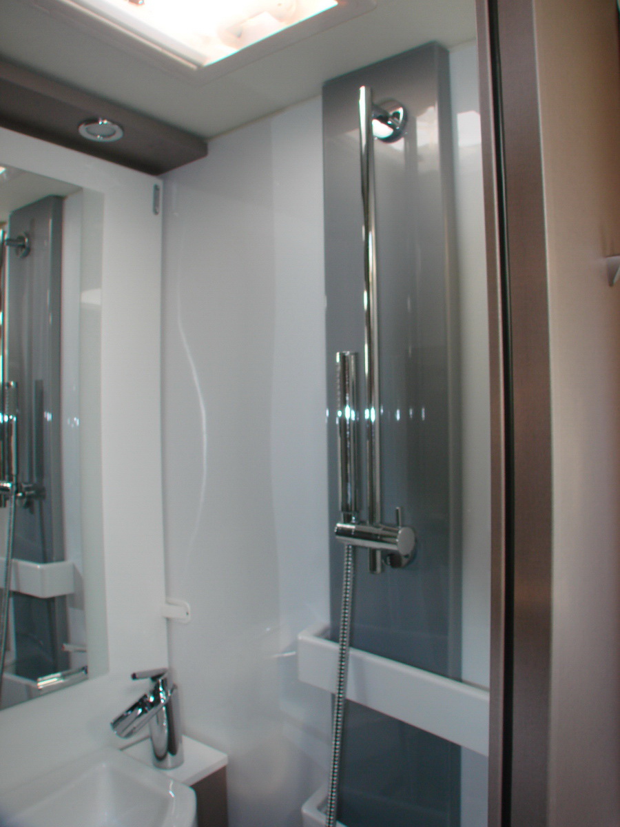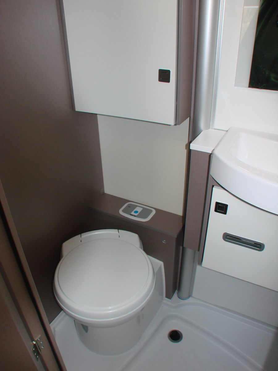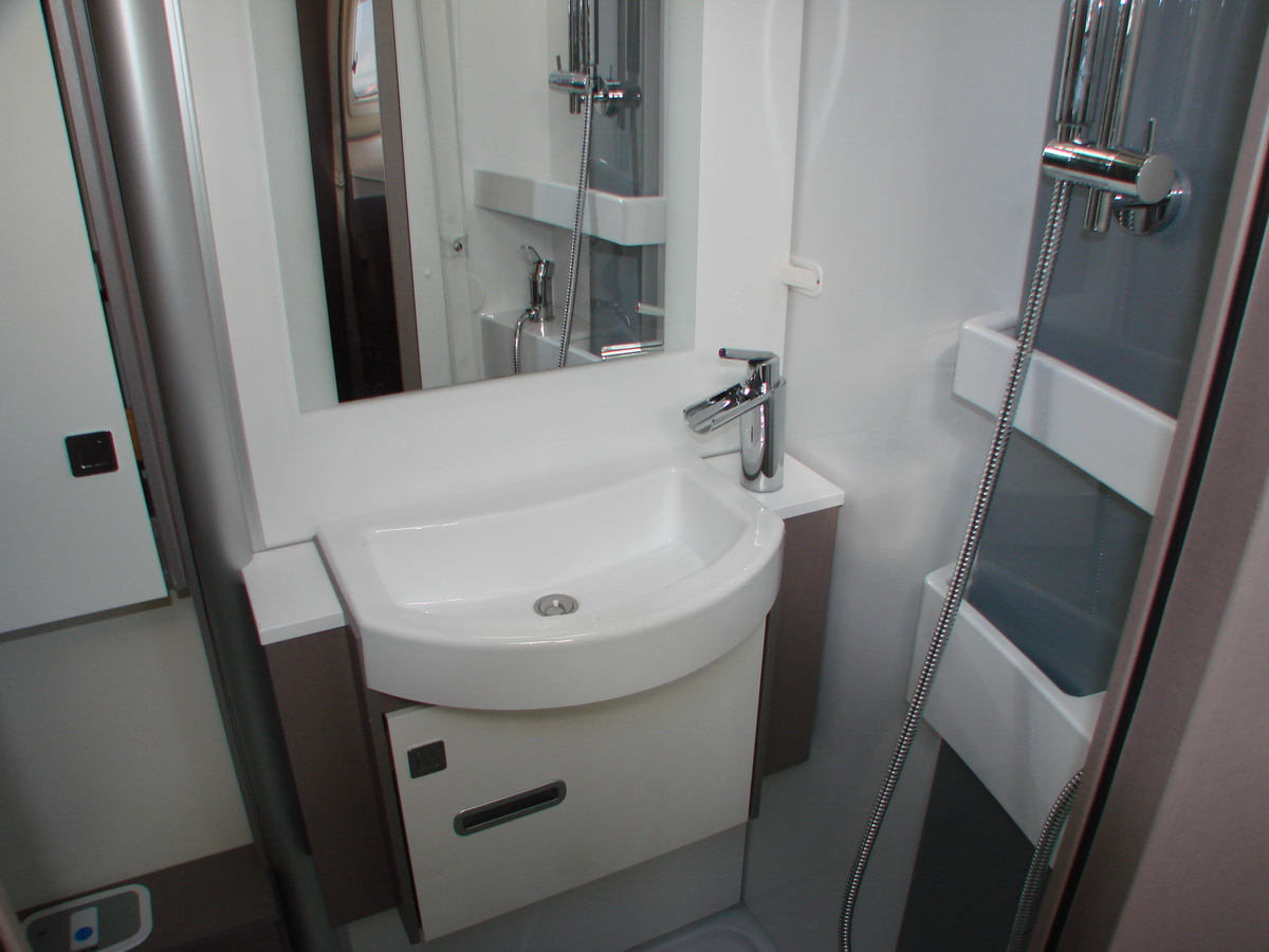 Das Fahrzeug ist ausgestattet mit einem modernen Bad sowie Toilette und Dusche.
